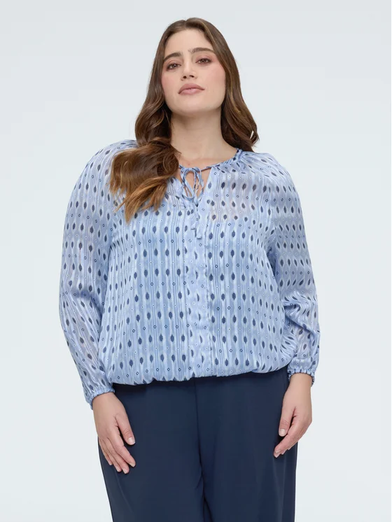 Scollo a V con laccetti decorativi, maniche lunghe a palloncino con elastico al polso; tessuto lurex per un effetto luminoso; comodo top in jersey da mettere sotto; perfetta per i momenti per l'ufficio e per i look quotidiani.