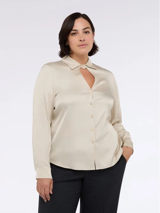 Colletto classico, maniche lunghe e scollatura cut out e bottoni gioiello; tessuto in raso di viscosa per una sensazione piacevole sulla pelle; versatile e facile da abbinare per look dal mattino alla sera; #livefree together perché: le fibre LENZING™ ECOVERO™ derivano da fonti di legno controllate o certificate e supportano morbidezza e drappeggio naturali.