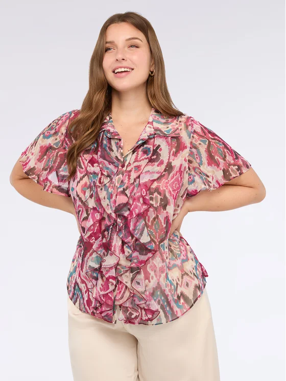 Colletto e maniche corte; tessuto in georgette con lavorazione a volant sul davanti; versatile e confortevole adatta per look da giorno e da sera; pensata e realizzata in Italia.