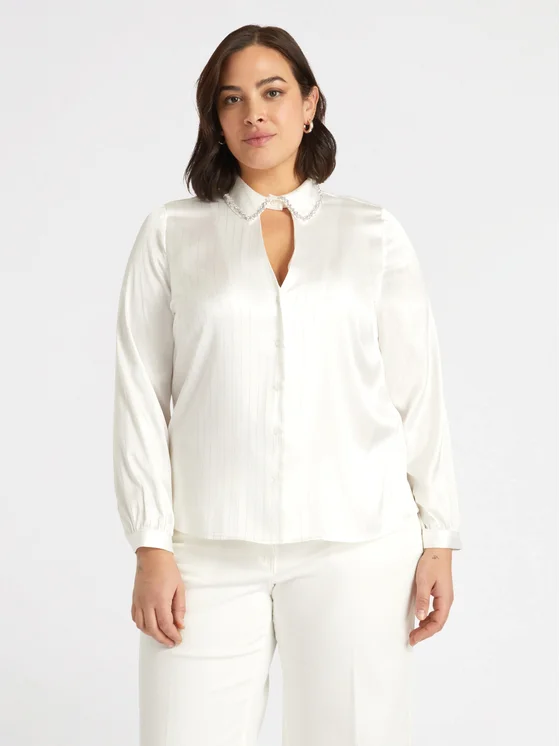 Camicia con cut out a goccia e colletto arrotondato con bordo in strass; maniche lunghe con arricciatura finale e polsino; leggera rigatura in lurex; ideale per i momenti speciali e per i look quotidiani