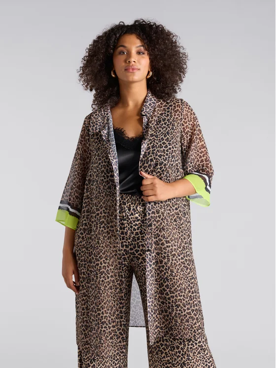 Camicia kaftano dalla stampa animalier, con bordi fluo, colletto, bottoni e maniche a tre quarti; #livefree together perché: stampa realizzata in Italia da Sublitex, azienda del Gruppo Miroglio, utilizzando inchiostri a base d'acqua certificati ed un processo water free; si asciuga rapidamente.