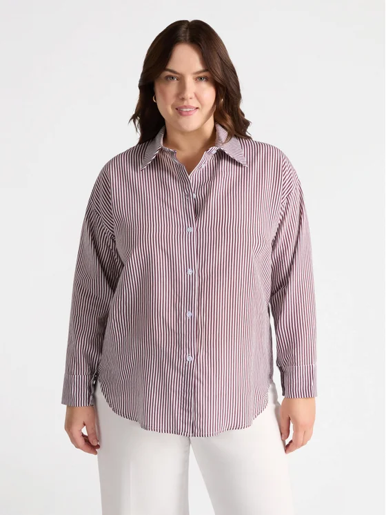 Camicia in popeline a righe nei toni del burgundy; colletto, polsini con due bottoni, carré dietro e fondo arrotondato; per look validi dal mattino alla sera; pensata e prodotta in Italia.