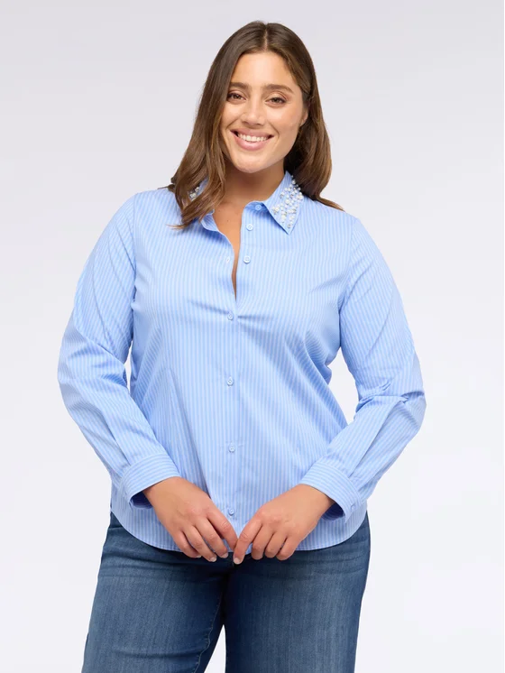 Maniche lunghe con polsini, chiusura frontale con bottoni; tessuto in popeline di cotone stretch; vestibilità e design per il massimo del comfort; perfetta dall'ufficio fino a sera.