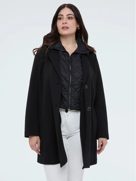 Cappotto in scuba con revers classici e davantino interno in piumino con cappuccio trapuntato; chiusura con bottoni sul cappotto e zip sul piumino; versatile e facile da abbinare; perfetto per i look quotidiani.