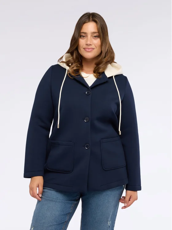 Giacca in tessuto scuba con cappuccio e chiusura frontale a bottoni; maniche lunghe e due tasche applicate sul davanti; vestibilità e design per il massimo del comfort; versatile e facile da abbinare per look quotidiani.