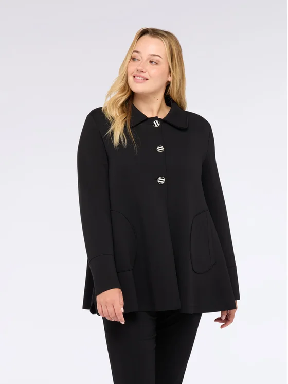 Giacca in scuba svasata; chiusura frontale con bottoni decorativi a contrasto; vestibilità e design per il massimo del comfort; versatile e facile da abbinare, perfetta per i tuoi look quotidiani.