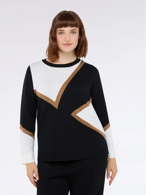 Design color block geometrico; vestibilità e design per il massimo del comfort; #livefree together perché: le fibre LENZING™ ECOVERO™ derivano da fonti di legno controllate o certificate e supportano morbidezza e drappeggio naturali; crea il total look in maglia con i pantaloni coordinati.