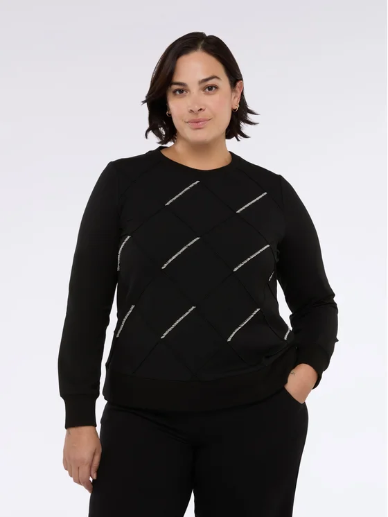 Tessuto morbido in jersey, scollo tondo e maniche lunghe; lavorazione a rombi con perline; vestibilità per il massimo comfort; perfetta da abbinare con pantaloni o denim.