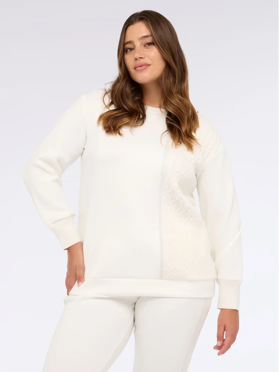 Scollo rotondo e maniche lunghe; lavorazione bimaterica con inserto a trecce sul davanti; morbidezza e comfort; ideale da abbinare a pantaloni coordinati per un look leisure chic!