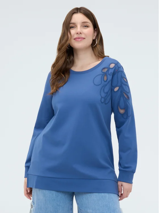 Scollo tondo e maniche lunghe; ricamo decorativo floreale ton sur ton e dettaglio cut out sulla spalla; perfetta da abbinare con pantaloni o denim per i tuoi daily look.