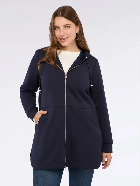 Felpa aperta con cappuccio, coulisse regolabile e zip a doppio cursore; realizzata in morbido tessuto scuba misto viscosa per il massimo del comfort; tasche frontali a filetto e polsini a costine; ideale da abbinare a jeans o leggings per un look casual e versatile.