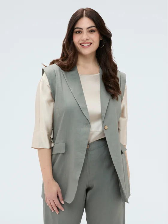 Tessuto misto lino con revers a lancia; chiusura monopetto con bottone singolo e tasche applicate; perfetto per i look quotidiani e per le occasioni speciali; crea il total look con i pantaloni coordinati!
