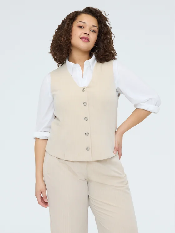 Scollatura a V monopetto con bottoni decorativi dorati; cinturino classico sul dietro per personalizzare il fit; tessuto effetto gessato; crea il total look con i pantaloni e il blazer coordinati!