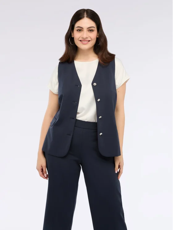 Gilet monopetto con bottoni decorativi, tasche laterali e cinturino posteriore regolabile; vestibilità e design per il massimo del comfort; realizzato in tessuto punto Milano misto cotone; versatile e facile da abbinare.