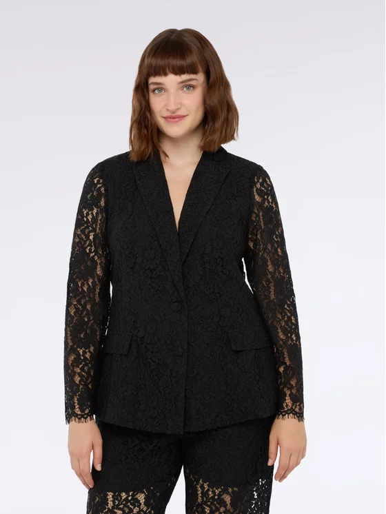 Blazer in pizzo con chiusura monopetto a bottoni; maniche lunghe in delicato pizzo traforato; vestibilità e design per il massimo del comfort; crea il total look con i pantaloni in pizzo coordinati.