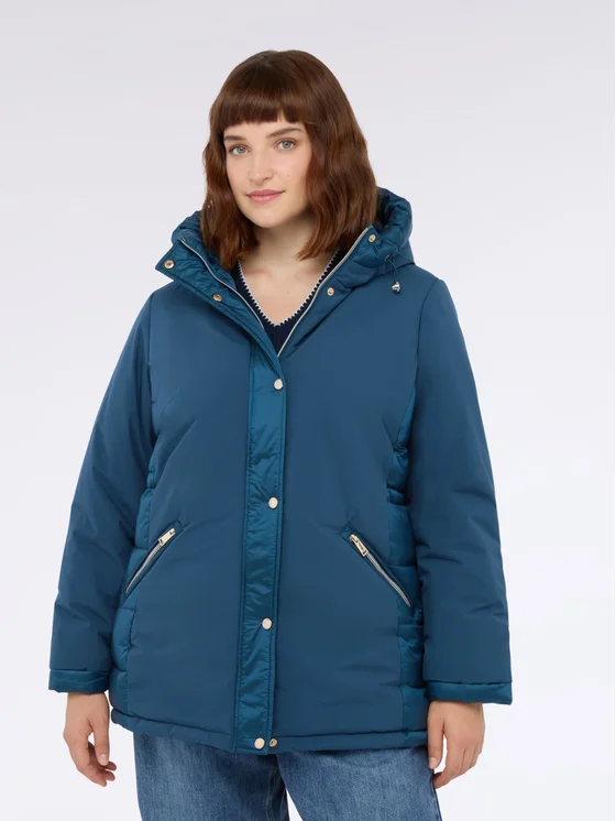 Piumino bimaterico con cappuccio, chiusura con bottoni e zip, tasche con zip; vestibilità regular per il massimo comfort, lunghezza media; design che mixa due tessuti differenti per un look versatile; #livefree together perché: imbottitura in Sorona® Aura, filato composto per il 37% da fonti rinnovabili.