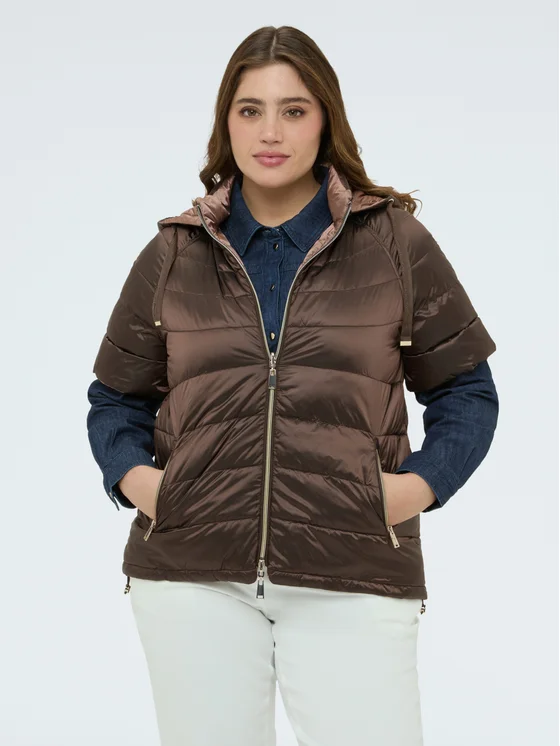 Cappuccio rimovibile, chiusura con zip centrale e tasche con zip; maniche corte e vestibilità svasata; indossalo da entrambi i lati per avere due look diversi; #livefree together perché: imbottitura in Sorona® Aura, filato composto per il 37% da fonti rinnovabili.
