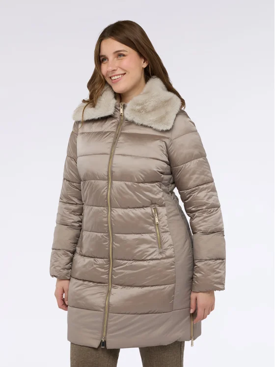 Chiusura zip a doppio cursore e due tasche frontali con zip; tessuto bimaterico che mixa due tessuti differenti per un design unico; Il capo è dotato di un collo in peluche removibile, fissabile tramite piccole asole inserite lungo il bordo del collo.; #livefree together perché: imbottitura in Sorona® Aura, filato composto per il 37% da fonti rinnovabili.