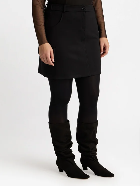 Minigonna con tasconi laterali in stile cargo e bottoni; zip e bottone davanti, passanti in vita, finte tasche; versatile e facile da abbinare; pensata e realizzata in Italia.