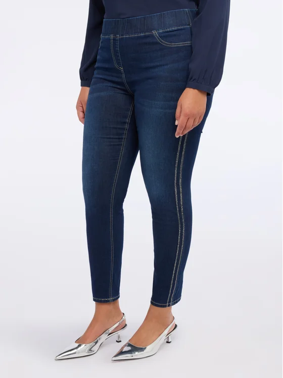 Dettaglio di strass laterale che aggiunge un tocco luminoso; vita elasticizzata per il massimo comfort; tasche posteriori e vestibilità aderente per un effetto second skin; #livefree together perché: fino al 60% di acqua risparmiata in fase di lavaggio, grazie a tecnologie di ultima generazione (rispetto a lavaggi tradizionali).