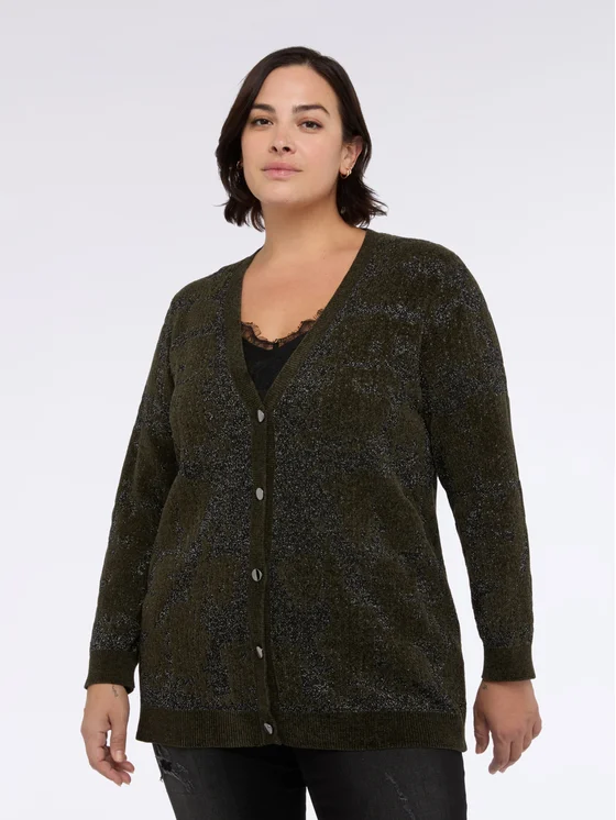 Scollo a V e chiusura con bottoni a vista; vestibilità e design per il massimo del comfort; lavorazione che dona un effetto brillante al capo; perfetto per completare i tuoi look quotidiani con un tocco luminoso.