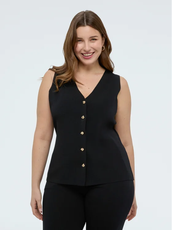 Scollo a V e chiusura con bottoni decorativi; realizzato in maglia fine di misto viscosa per comfort e morbidezza; perfetto per creare look versatili da abbinare con i tuoi capi preferiti; questo capo nel colore bianco è disponibile in esclusiva online.