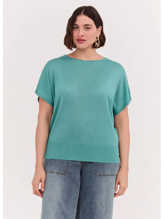 T-shirt in Tencel dal fit morbido e confortevole; scollo rotondo, maniche corte a kimono, fondo con fascia; vestibilità fluida e rilassata; per look quotidiani dallo stile semplice ma curato.