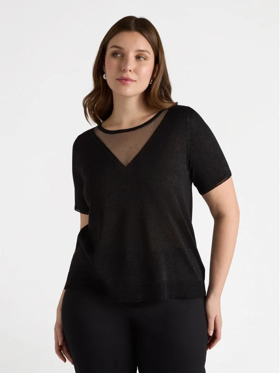 Maglia maniche corte in con apertura a V e inserto trasparente sullo scollo; linea boxy; design studiato per garantirti il massimo del comfort; per look validi dal mattino alla sera.