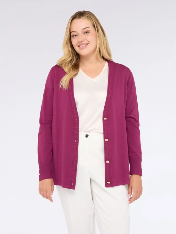 Cardigan con scollo a V realizzato in maglia fine mista viscosa; chiusura frontale con bottoni a vista, maniche lunghe con bottoni sul polsino; comodo, versatile e facile da abbinare; #livefree together perché: le fibre LENZING™ ECOVERO™ derivano da fonti di legno controllate o certificate e supportano morbidezza e drappeggio naturali.