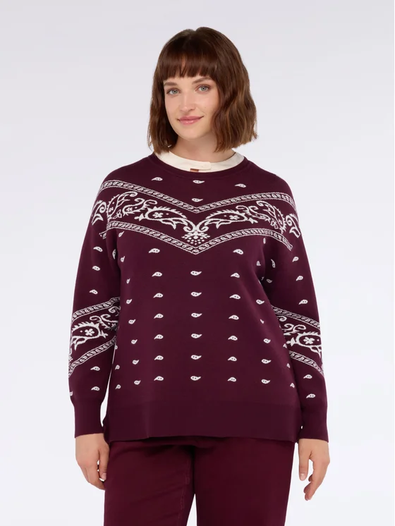 Scollo rotondo, ricamo jacquard motivo bandana e maniche lunghe; realizzata in maglia fine mista viscosa; vestibilità e design per il massimo del comfort; abbinala ai tuoi pantaloni o jeans preferiti!