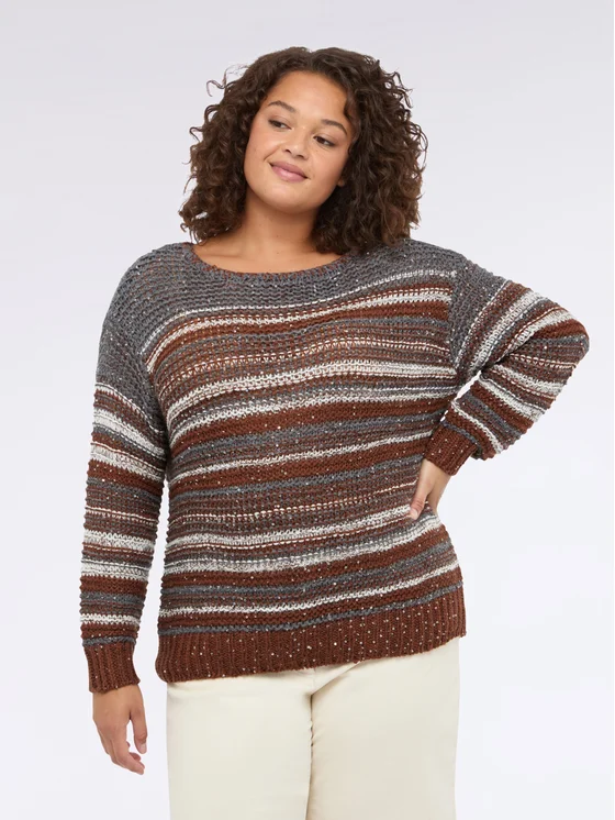 Scollatura a barchetta, maglia con lavorazione a righe multicolore; maniche lunghe a giro basso; impreziosita da paillettes applicate per un effetto luminoso; ideale da abbinare a pantaloni e jeans per un look casual-chic.