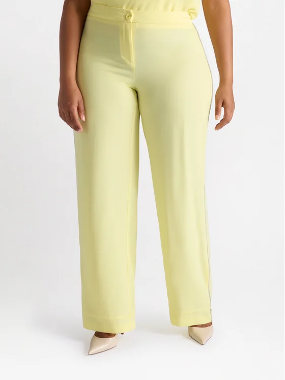 Pantaloni dritti con nastro lurex inserito nella cucitura laterale; zip e bottone davanti; perfetti per un'occasione speciale.