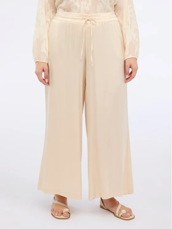 Pantaloni wide leg con vita elasticizzata e coulisse; tasche laterali e gamba ampia per la massima libertà di movimento; per look validi dal mattino alla sera; pensati e realizzati in Italia.