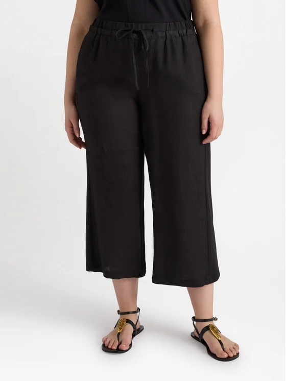 Pantaloni gamba larga in lino, con bordi lungo le gambe e in vita in jersey; mixa due tessuti differenti; lacci in vita, tasche verticali.