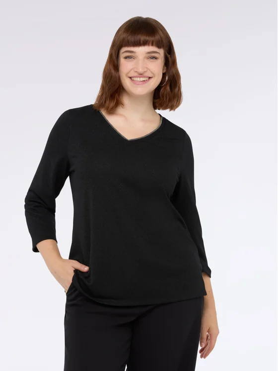 Scollo a V e maniche a tre quarti; vestibilità e design per il massimo comfort; realizzata in jersey misto viscosa; la variante NERA è un'esclusiva ONLINE!