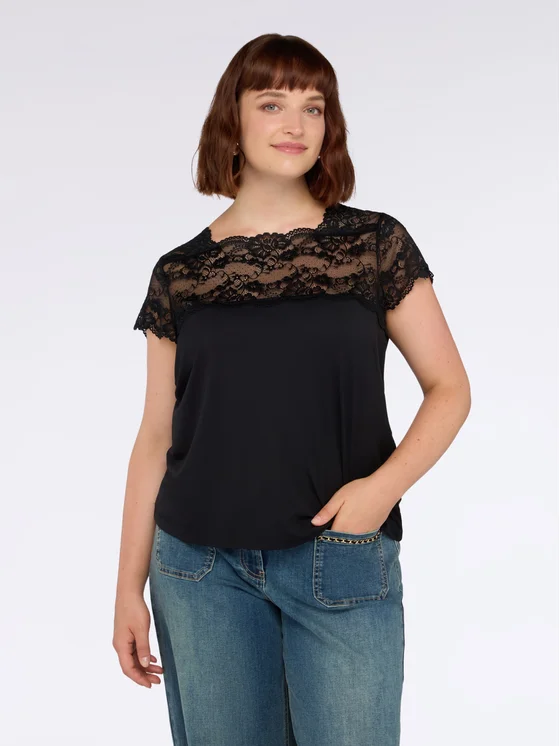 Scollo a barchetta e maniche corte; maniche e parte superiore in pizzo; realizzata in morbido jersey per un comfort ottimale; versatile e perfetta per look validi dal mattino alla sera.