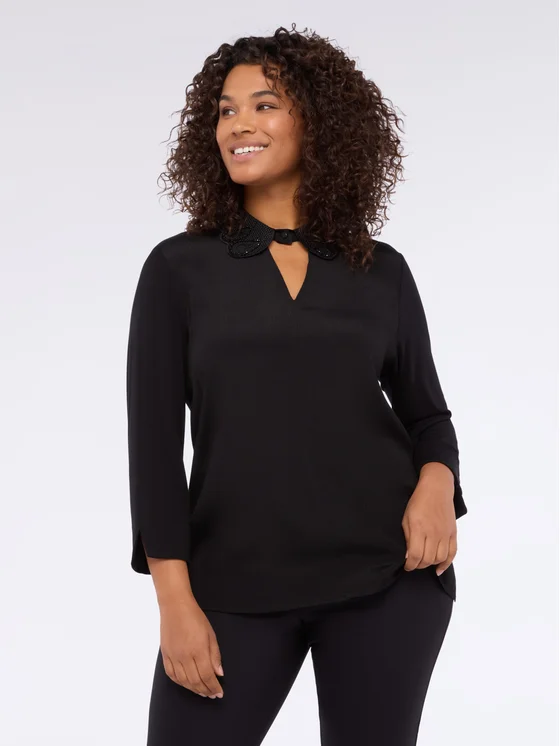 Colletto prezioso, maniche lunghe, tessuto bimaterico e taglio svasato; vestibilità e design per il massimo del comfort; #livefree together perché: le fibre LENZING™ ECOVERO™ derivano da fonti di legno controllate o certificate e supportano morbidezza e drappeggio naturali; per look validi dal mattino alla sera.