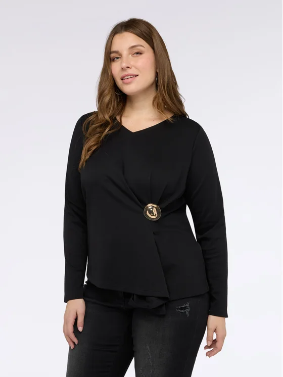 Scollo a V e maniche lunghe; applicazione decorativa con bottone dorato e dettaglio asimmetrico; vestibilità per il massimo del comfort; abbinala ai tuoi jeans preferiti!.