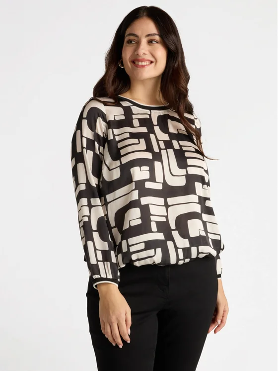 T-shirt maniche lunghe stampa optical black and white; davanti in raso e dietro in jersey tinta unita per un effetto confortevole; elastico al fondo e bordo sulla scollatura; pensata e prodotta in Italia.
