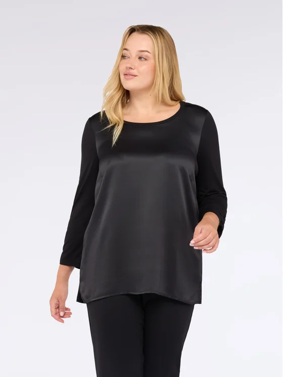 Scollo a barchetta e maniche a tre quarti; bimaterica con combo di tessuti diversi davanti in raso e retro in jersey; vestibilità e design per il massimo comfort; #livefree together perché: creato con materiali in parte riciclati (min. 20%) in modo da limitare l'utilizzo di materie prime vergini.