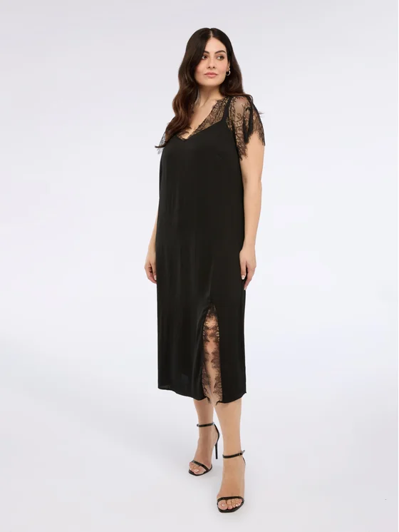 Slip dress con scollo a V e maniche corte in pizzo; perfetto per i momenti speciali e per i look quotidiani; #livefree together perché: creato con materiali in parte riciclati (min. 20%) in modo da limitare l'utilizzo di materie prime vergini.