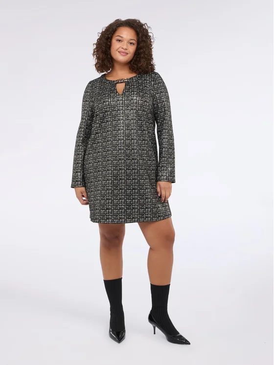 Tessuto Punto Milano; scollo con dettaglio cut out e catena decorativa; vestibilità comoda; per look chic validi dal mattino alla sera.