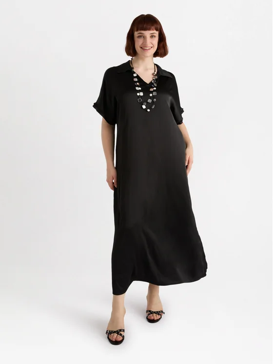 Vestito lungo in raso con colletto e maniche corte rifinite da un bordo sfrangiato; linea dritta e spacchi al fondo; per look validi da mattino a sera.; pensato e prodotto in Italia.
