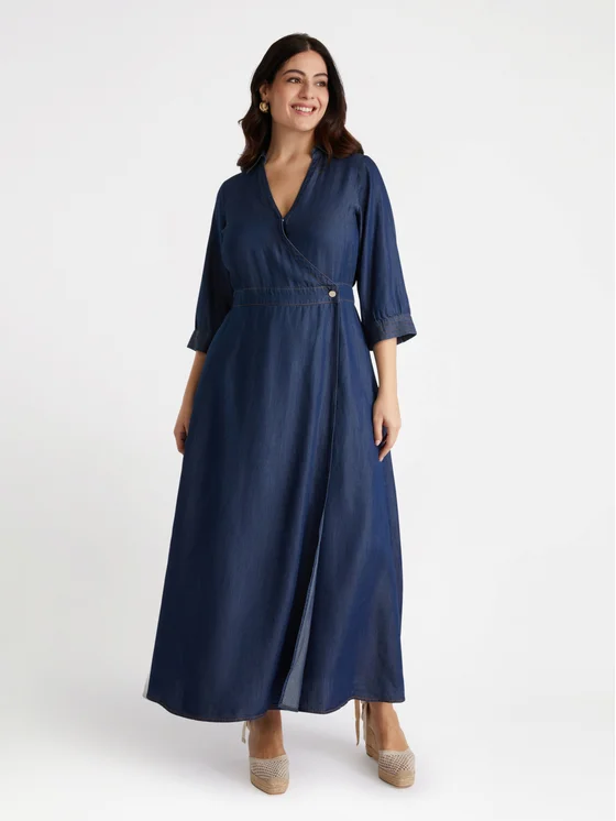 Vestito lungo con fibre in TENCEL™ Lyocell incrocio davanti, colletto, maniche a tre quarti.; #livefree together perché: le fibre TENCEL™ Lyocell e Modal derivano da fonti di legno controllate o certificate e supportano una naturale sensazione di asciutto attraverso il controllo dell'umidità