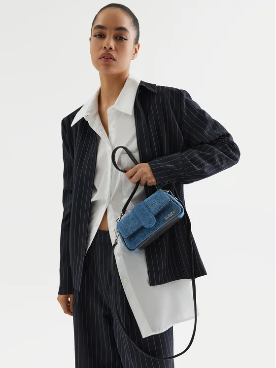 La piccola borsa a tracolla blu Le Petit Bambimou di Jacquemus è un accessorio elegante che combina materiale jeans con una lussuosa finitura in pelle di agnello nera. Sul davanti presenta un logo metallico, mentre sul retro c'è una pratica tasca a fessura. L'interno, completamente foderato in morbido cotone, contiene uno scomparto con spazio per una carta. La borsa è dotata di un manico corto rimovibile e di una tracolla lunga staccabile, permettendo di indossarla in diversi modi. La chiusura magnetica garantisce comodità di apertura e chiusura, oltre alla sicurezza del contenuto.