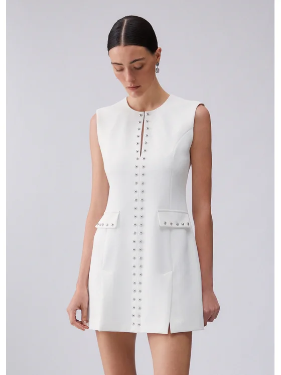 Un bianco impeccabile, con un accento metallico che cambia tutto. Questo abito in crêpe definisce una silhouette contemporanea, con borchie che illuminano e slanciano la figura. Perfetto per look d’impatto, potrai sceglierlo con sandali con tacco, mini bag e giacche ton sur ton.