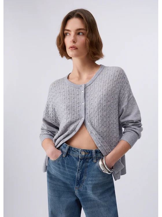 La morbidezza della lana incontra i bottoni gioiello in un modello dall'elegante lavorazione a trecce. Questo cardigan da donna svela un lato un po' glam e un po' ladylike, perfetto per completare i tuoi look da giorno.