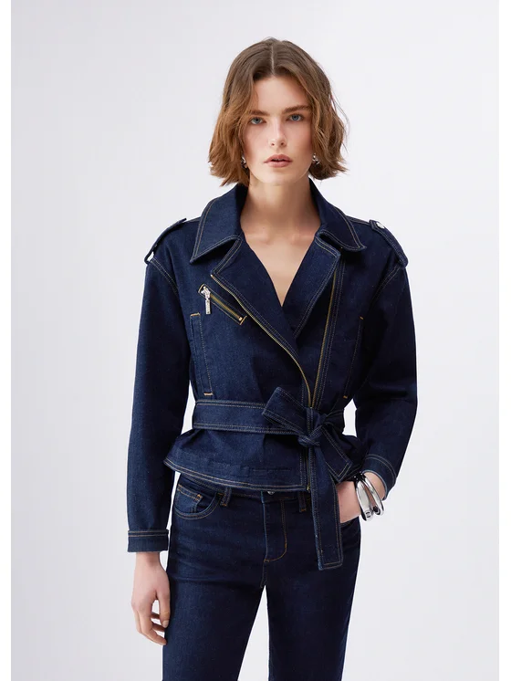 Taglio deciso, lavaggio scuro, cintura tono su tono che segna la vita e rende il più femminile senza perdere carattere: questo chiodo in denim dona subito energia al look.
