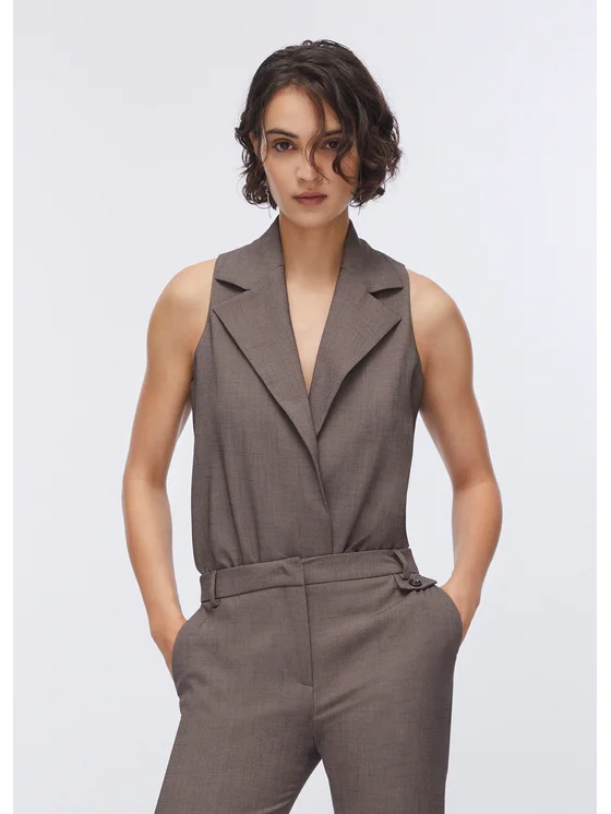 Un gilet che interpreta il tailoring in chiave femminile. La linea pulita e il tessuto mélange disegnano una silhouette essenziale ma d'impatto, con uno scollo profondo seducente. Da indossare in coordinato con i pantaloni, per un’eleganza moderna che non ha bisogno di costruzioni.