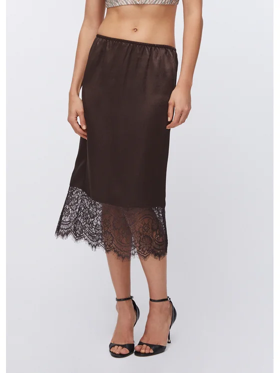 Il raso di questa gonna longuette dà profondità alla nuance caffè mentre il pizzo sul fondo aggiunge un accento femminile, senza eccessi. Con una camicia morbida sarà una scelta cool per il giorno, con top in raso e sandali con tacco diventa la scelta giusta per la sera.